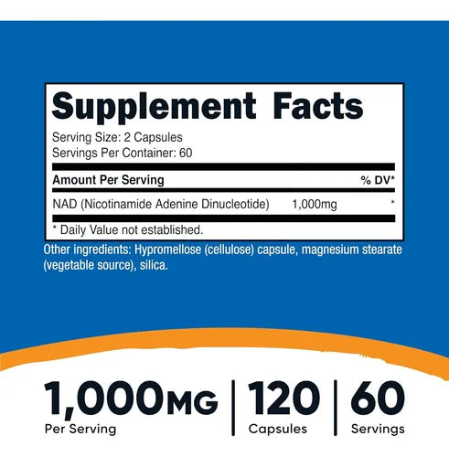 Nutricost NAD es un suplemento dietético que contiene nicotinamida adenina dinucleótido (NAD), una coenzima esencial para la producción de energía y el metabolismo celular. Se utiliza para apoyar el bienestar general, la salud celular y la función cognitiva, además de promover el envejecimiento saludable.